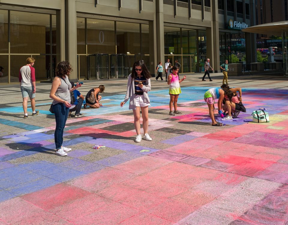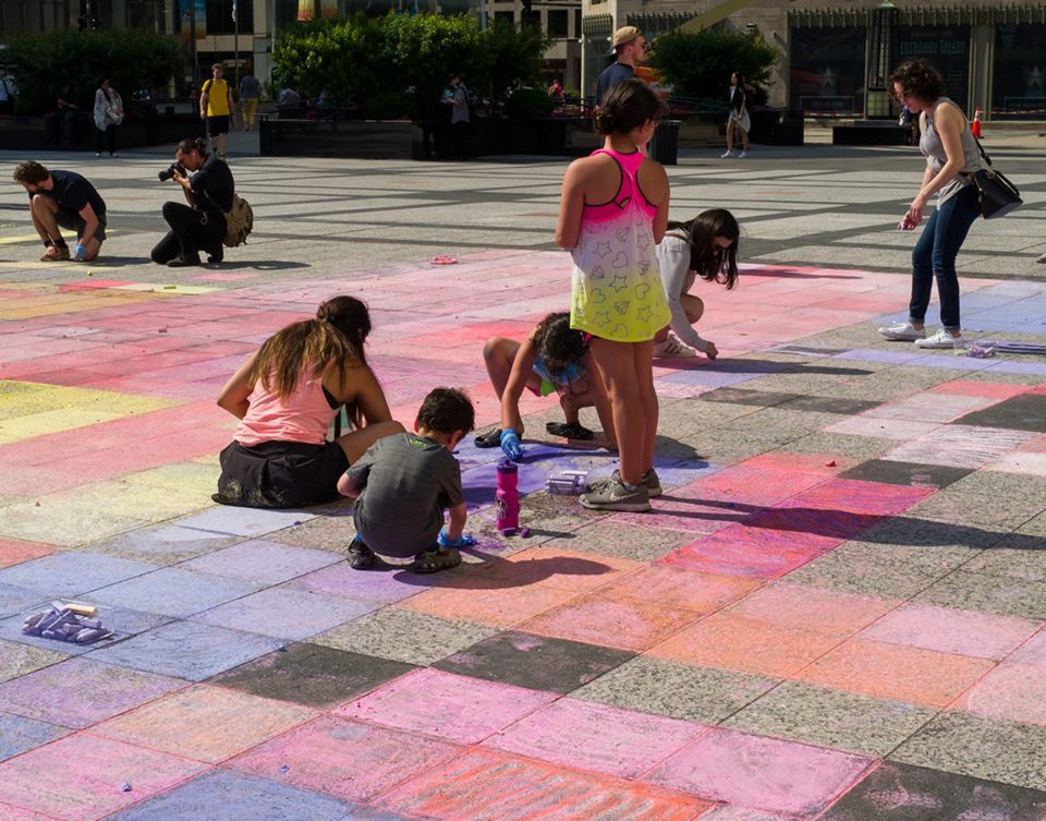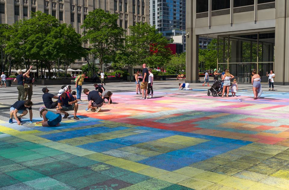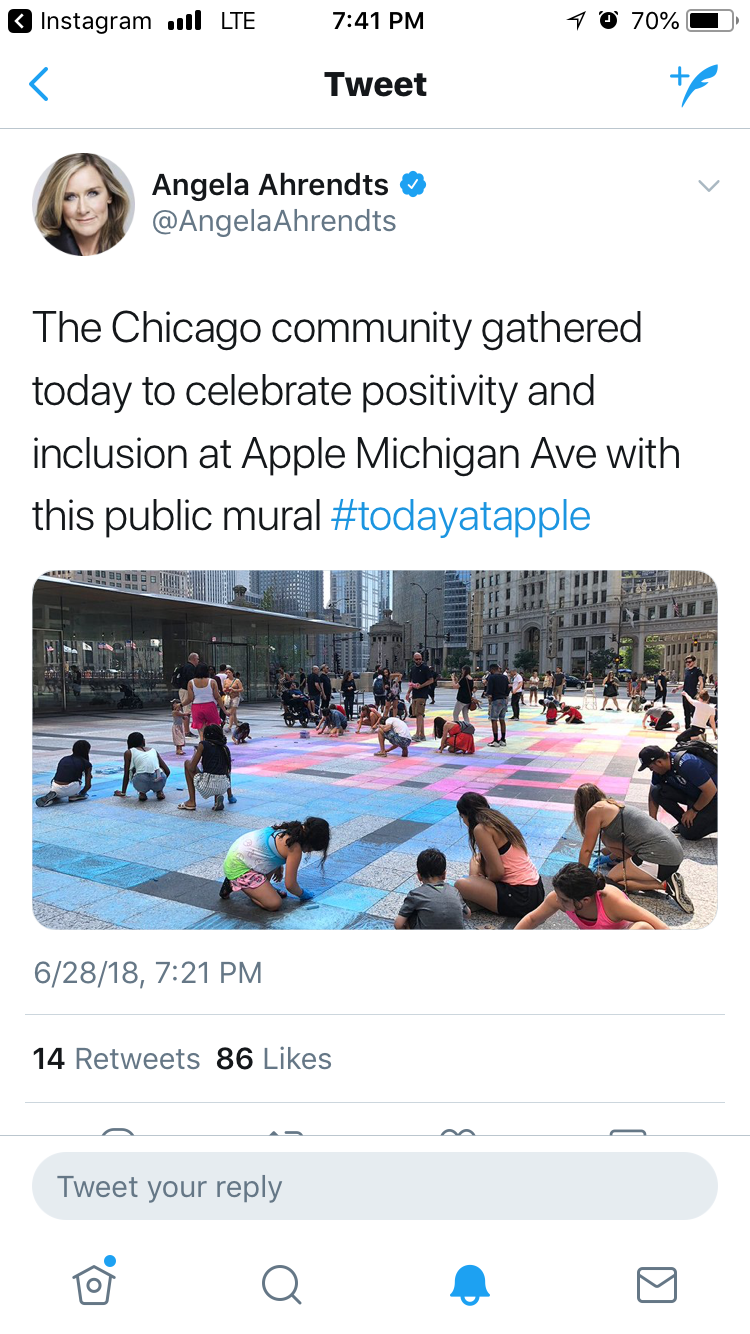 Sometimes the universe just gives you gold and when it does you have to go with it. Apple reached out to have me speak at their Michigan Ave. Flagship as part of their ongoing Artist Talks. I've never had such an amazing initial call. After we finished the initial chat, they called me back and asked if I had another 10-15 minutes. They told me they could create something on the Pioneer Court Plaza a couple of times a year and wanted to know if I'd be interested. Huge participatory art right in the heart of downtown Chicago? Of course I was interested. I originally pitched a giant pixelated retro Apple Logo with we all live here written across in the original Mac font called Chicago. I didn't get to use the logo but I did get to use the font. The activity was such a huge success that it caught the eye of Angela Ahrendts, Apple's Head of Retail and former CEO of Burberry and she tweeted about it. Always take the gold when the Universe offers it.