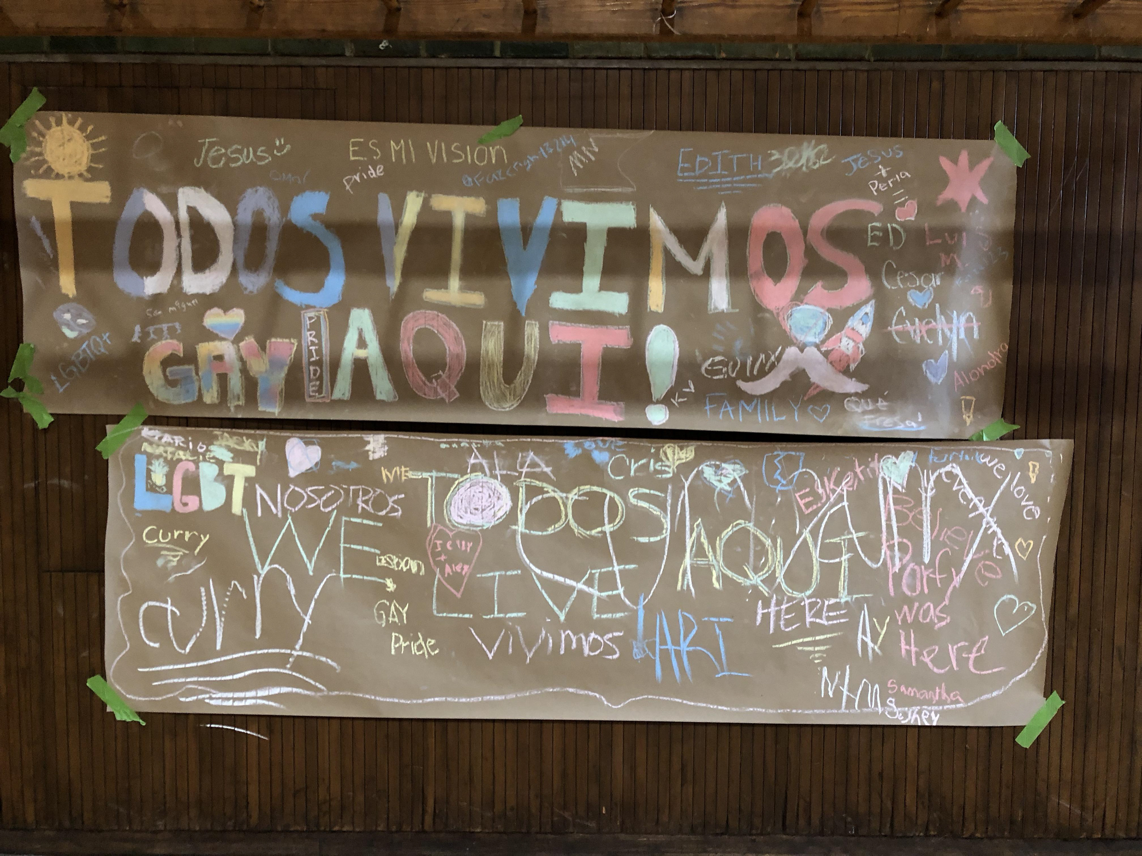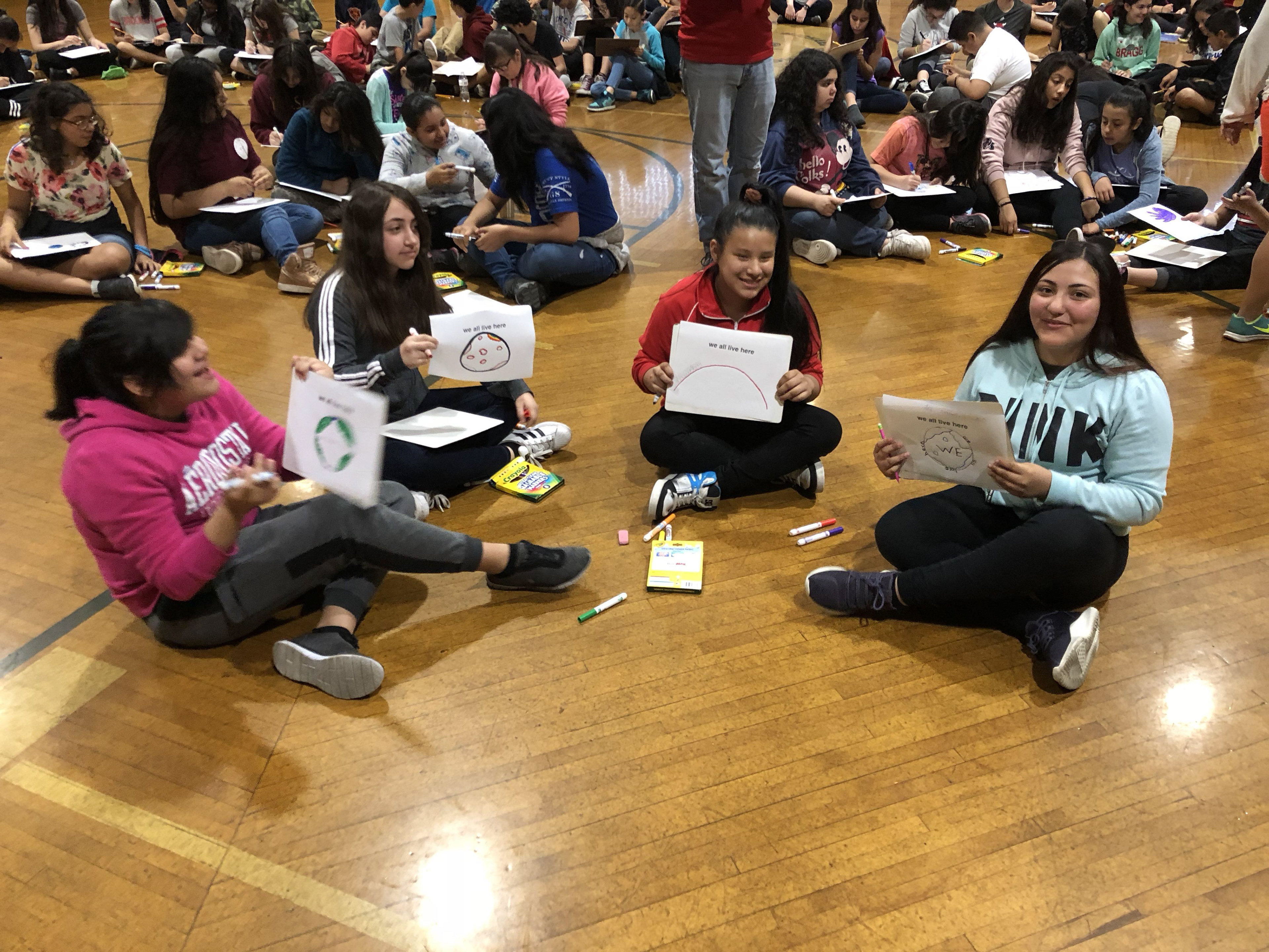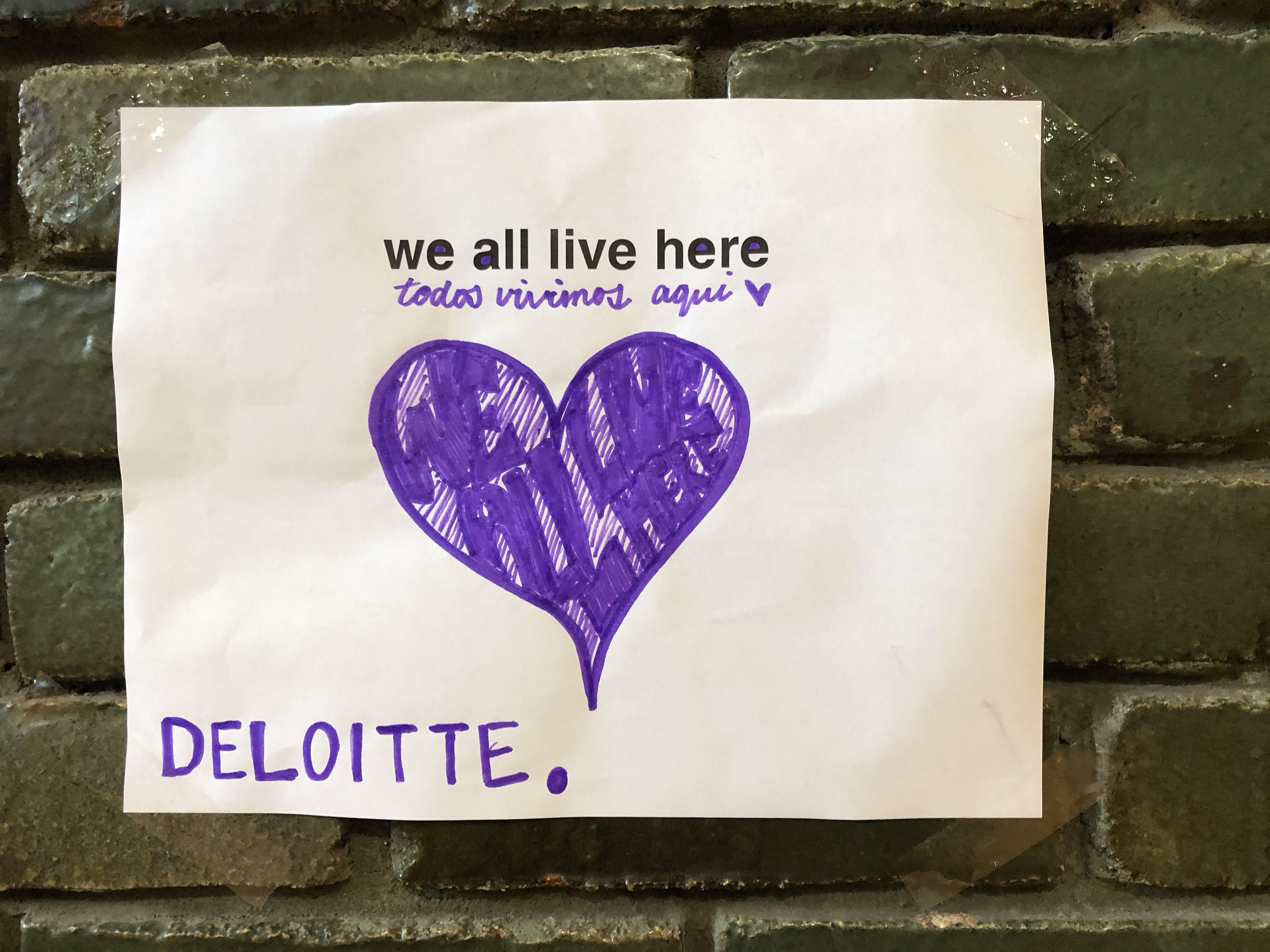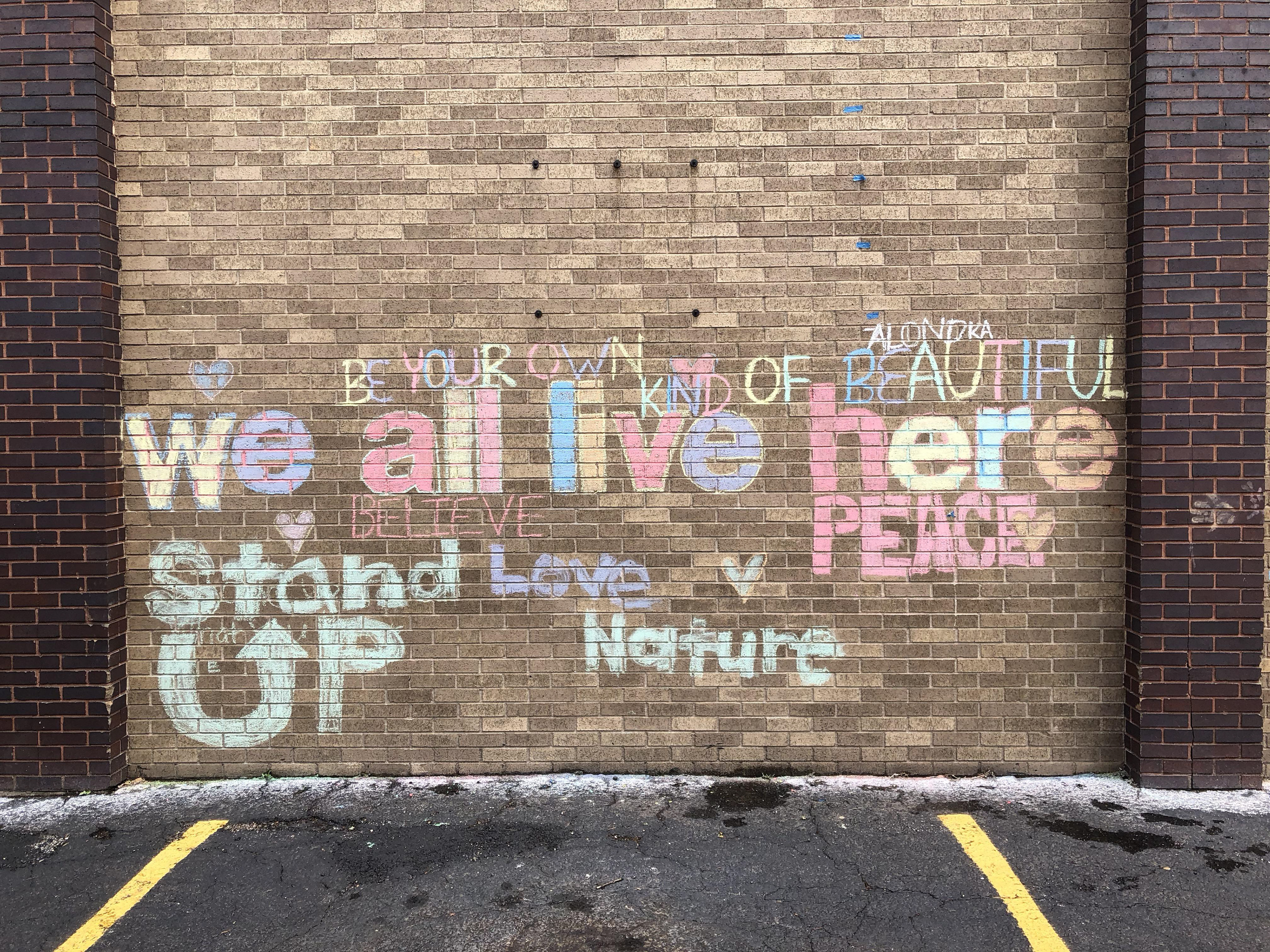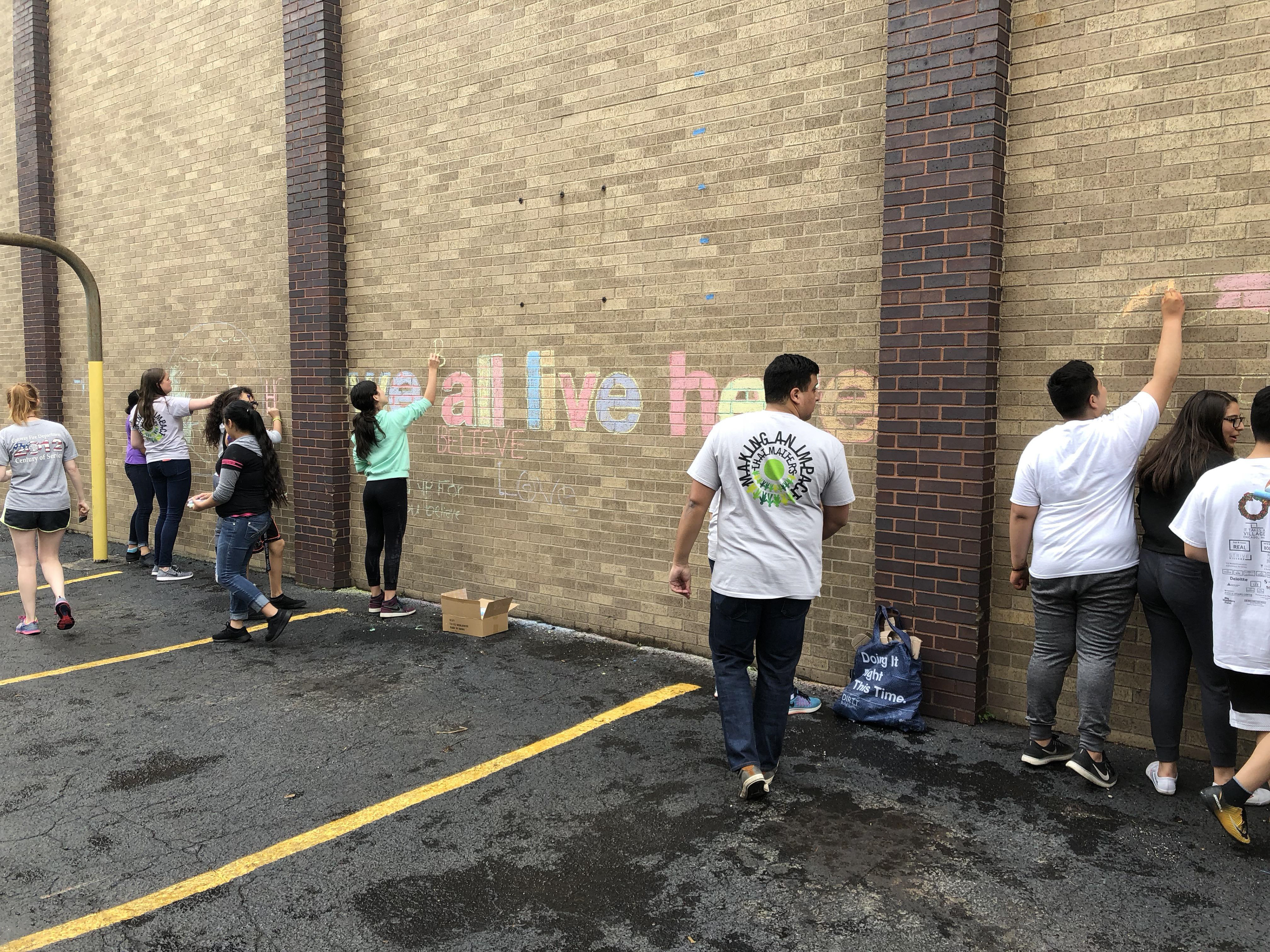 On 6/8/18 we all live here worked with Deloitte on their Impact Day. Together we visited San Miguel School in Chicago's Back of the Yards neighborhood, where we created murals and chalked up the school with positive and inclusive messages. The students helped create a we all live here logo for their school and we made a huge mural for the cafeteria which is used by the community, the church and the school. I didn't expect the CEO of Deloitte Consulting or the Managing Director of Deloitte Chicago to attend but they sure made for a couple of amazing endorsements.
